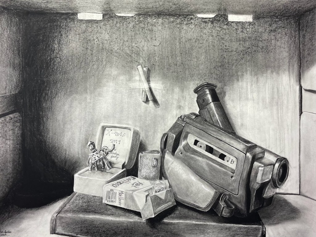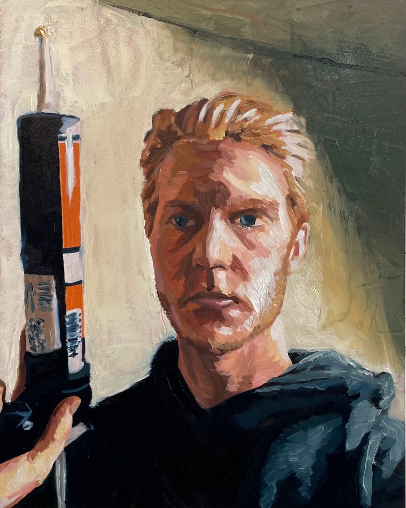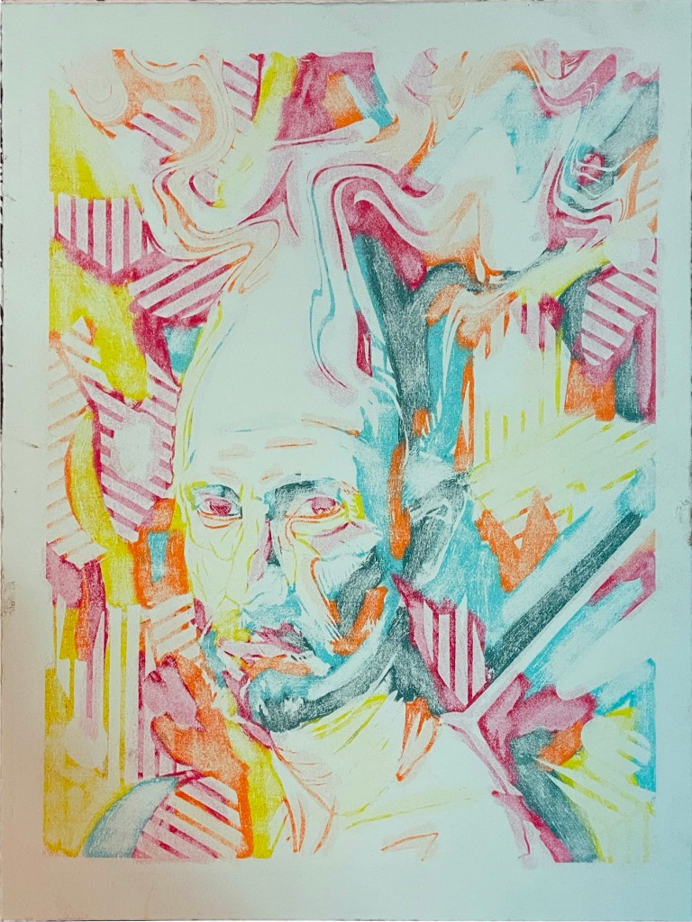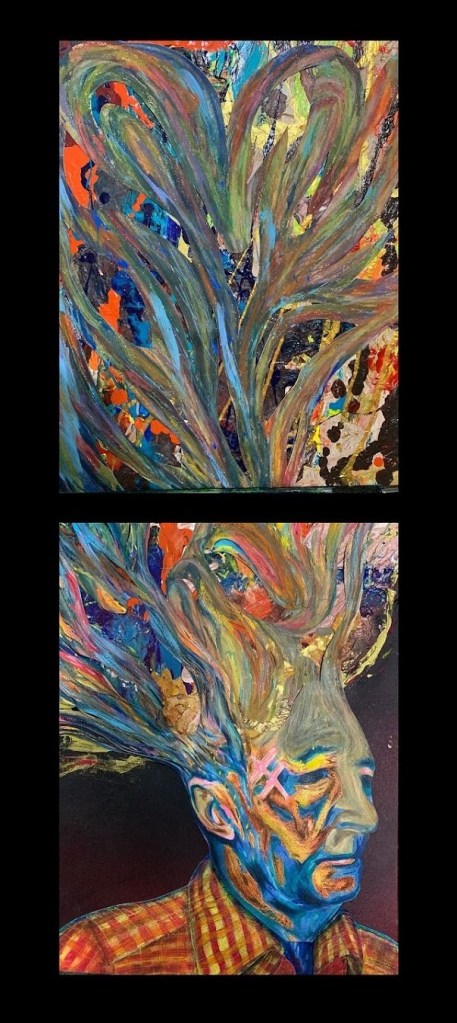 acrylic paint, leather paint and spray paint on canvas, alcohol ink, chalk pastel and oil pastel on paper